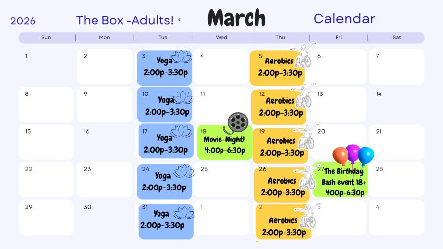 The Box Club for Adults is a welcoming social club that brings adults with disabilities together for themed parties, game nights, karaoke, and celebrations. Built for ages 18 and up, the club focuses on safe, intimate events where members build friendships, make memories, laugh, and have fun. Events run on select Wednesdays and Fridays, so check the calendar and join an event that fits your schedule. 📅😊