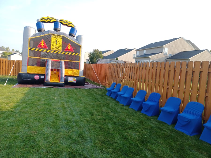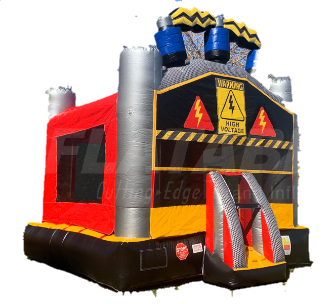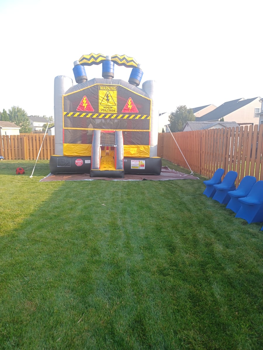 Reserve your fun High voltage Bounce House for your special occasion. This Bounce House is 16 ft High, 18 ft. Length and 15 feet wide. This heavy duty commercial nflatable is our largest inflatable in stock. Get ready for a Funlicity time with this unique style Bounce house.