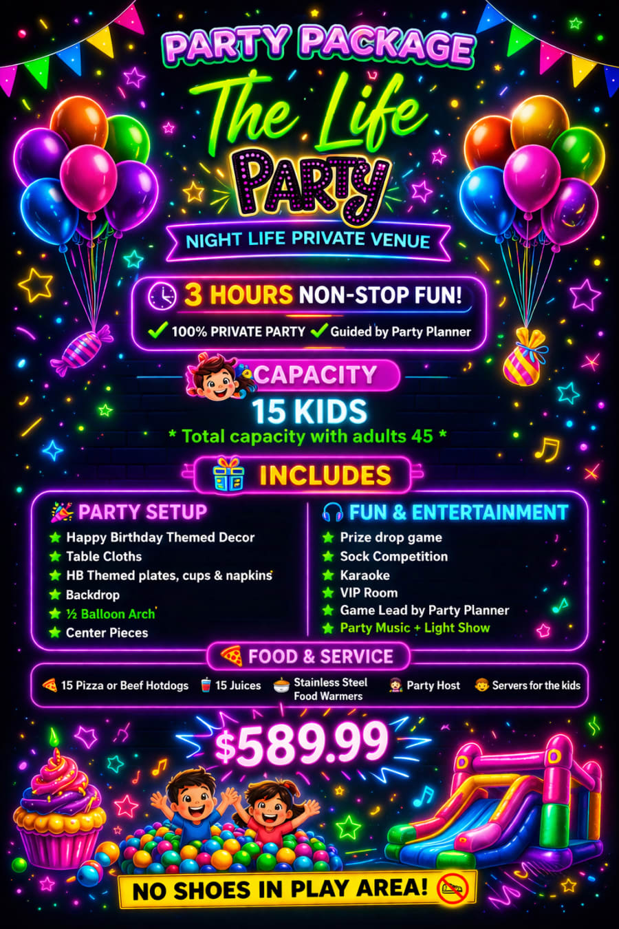 Night Life Party Package delivers a 3-hour, all-inclusive private event filled with fun, food, games and unforgettable memories!