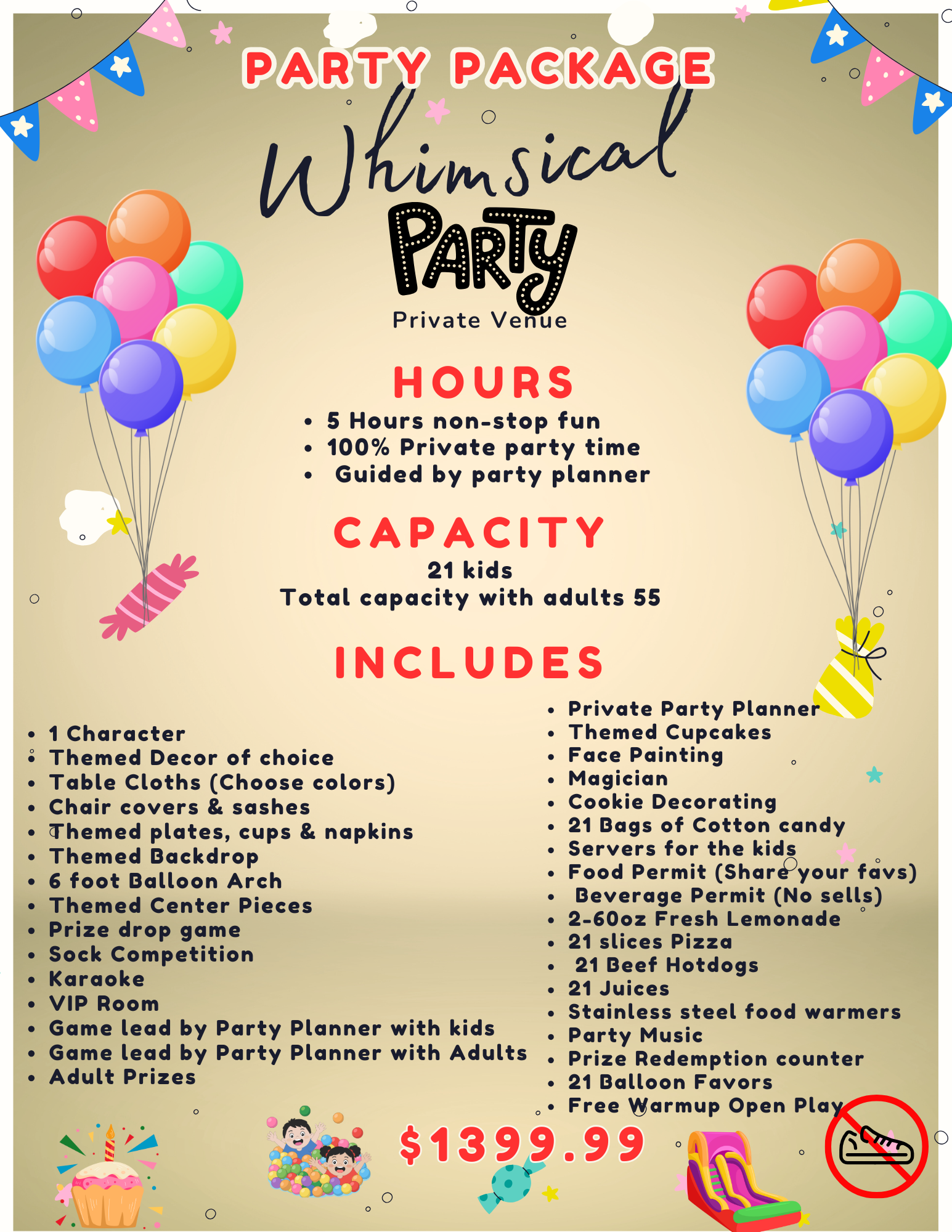 - Games and Activities Led by a Dedicated Party Coordinator for kids and adults with Prizes.